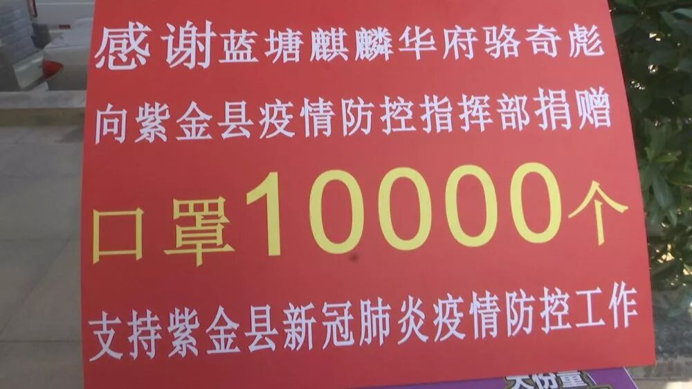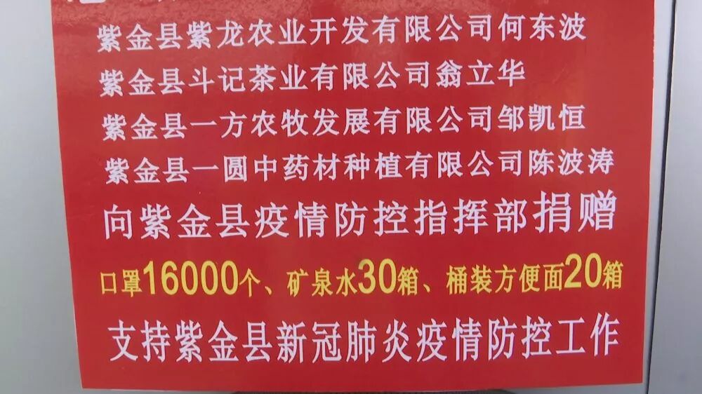 捐赠仪式上,各爱心企业负责人分别向县疫情防控指挥部移交了自行募集到的疫情防控物资和善款。其中紫金县紫龙农业开发有限公司、紫金县斗记茶业有限公司、紫金县一方农牧发展有限公司和紫金县一圆中药材种植有限公司共同捐赠了16000个口罩、30箱饮用水和20箱方便面;紫金麒瑞房地产开发有限公司捐赠了10000个口罩,同时向县民政局社会捐赠接收工作站捐款10万元。