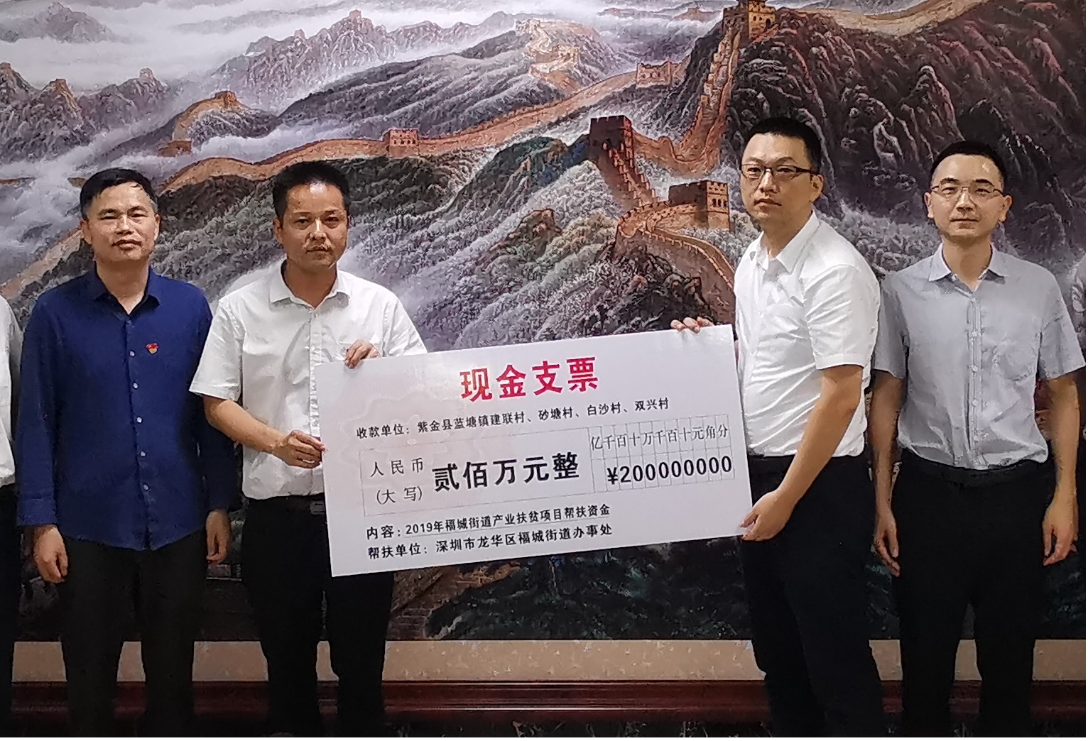 会上,冯瑞书记首先代表福城街道党工委、办事处感谢蓝塘镇党委、镇政府对街道驻蓝塘镇扶贫工作组在工作、生活上的大力支持和关心,并介绍了福城街道经济社会发展情况。冯瑞书记对进一步做好对口帮扶工作提出三点建议:一是继续加强四个省定贫困村的对口帮扶力度,推进扶贫产业向规模化转变,以扶贫产业带动贫困户脱贫,紧盯考核目标任务,确保贫困户脱贫一个不落,返贫一个没有;二是深度挖掘蓝塘农业商机,打通农产品销售渠道,加强福城、蓝塘两地沟通交流,探寻农业资源,开发有潜力的农业项目;三是鼓励社区股份公司、工商联动员辖区居民、会员企业等深入四个村,开发农村生态旅游资源,拓宽扶贫渠道。座谈会期间,福城、蓝塘双方举行帮扶资金捐赠仪式,冯瑞书记代表福城街道党工委、办事处向蓝塘镇建联、砂塘、白沙、双兴村捐赠扶贫产业扶贫项目帮扶资金200万元。紫金县委常委、龙华区对口帮扶紫金指挥部指挥长谢秉波、紫金县扶贫工作局局长杨海棠、副局长何培根、蓝塘镇四个省定贫困村党(总)支部书记参加了会议。