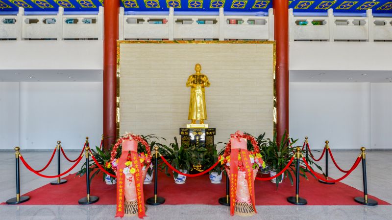 紫金中坝孙中山纪念馆 位于紫金县中坝圩镇。是重檐庑殿顶的仿古建筑,前廊7间8柱。2010年10月动工建设,2011年5月落成开馆,投资760万元,占地面积3100多平方米,建筑面积约908平方米。一楼安放有孙中山铜像、陈列孙中山入粤始祖开基地沙盘模型;二、三楼设展览厅,展出孙中山的祖籍渊源及其生平史料等。