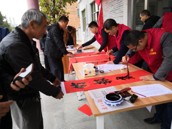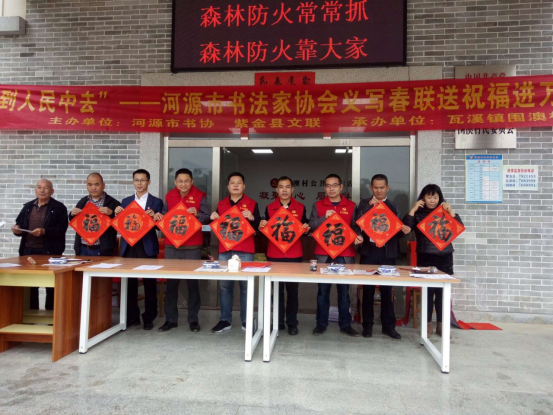 为深入学习贯彻党的十九大精神和习近平总书记视察广东重要讲话精神,在2019年春节即将到来之际,认真落实省委宣传部关于广泛开展文化惠民活动的精神,为广大群众营造良好节日气氛,1月15日上午,由河源市书协、紫金县文联主办的“到人民中去”--河源市书法家协会义写春联送祝福进万家活动走进瓦溪镇围澳村开展文化惠民活动。中国书法家协会会员、县文联专职副主席林冠明,以及市县著名书法家湛志锋、俞金海、叶小勇等书法家,不顾微微细雨,早早地赶到围澳村委门口,摊开红纸,做着准备工作,送“福”进万家,为广大市民免费义写春联、送“福”字。