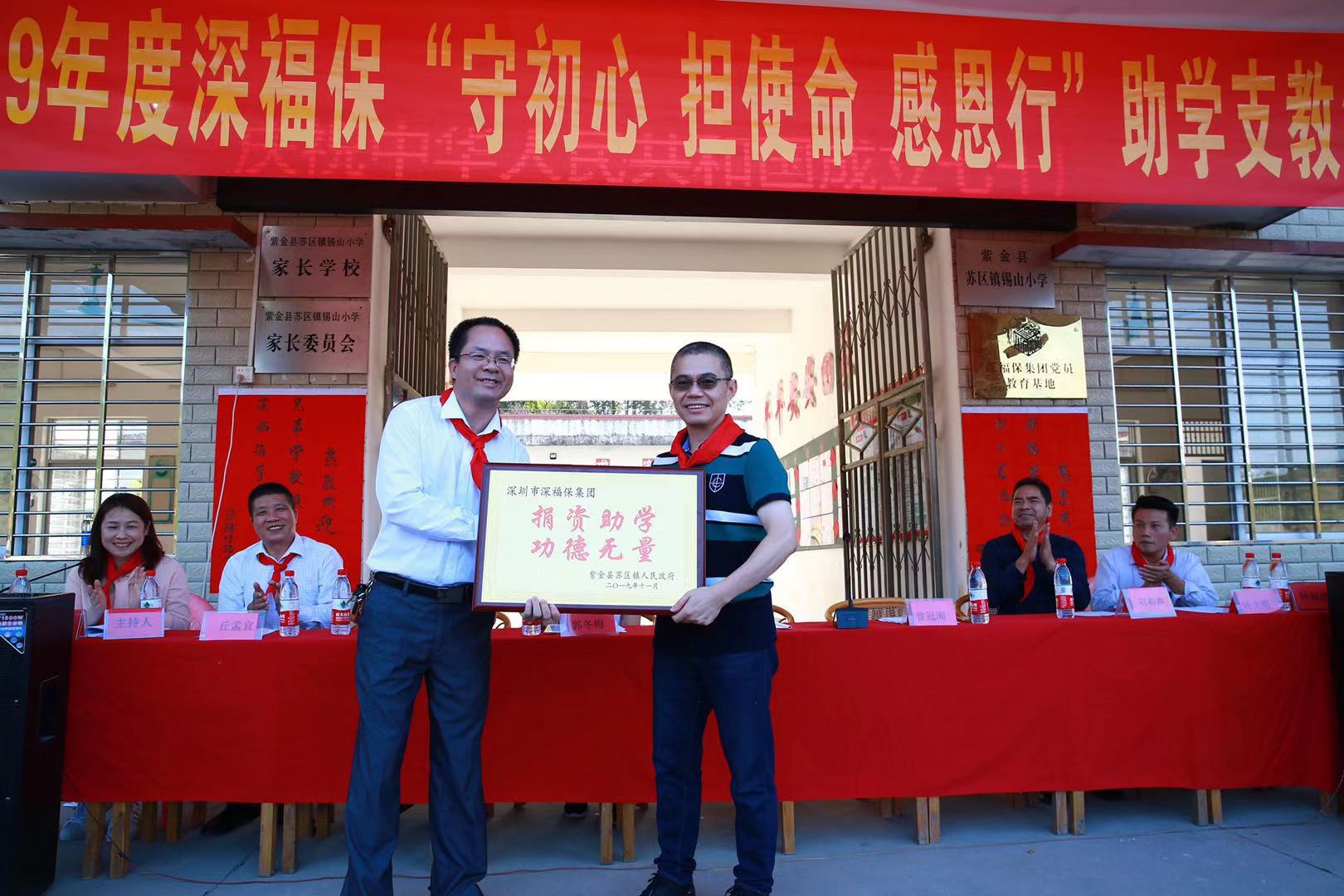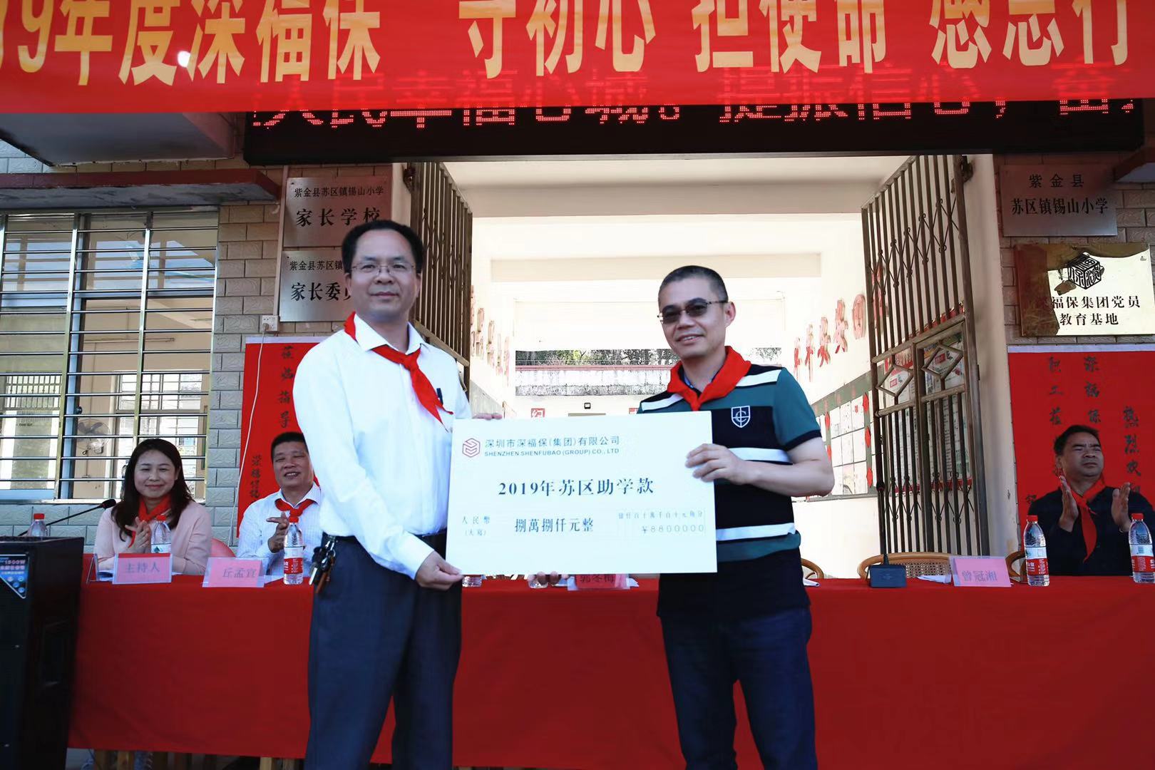 日前,深圳市深福保集团“守初心、担使命、感恩行”助学活动在苏区镇深福保锡山希望小学举行。深福保集团董事长刘育兵、苏区镇分管教育工作领导曾冠湘、深福保锡山希望小学师生代表等100多人出席助学活动。据悉,今年助学活动是深福保集团连续十五年帮扶苏区镇教育事业。