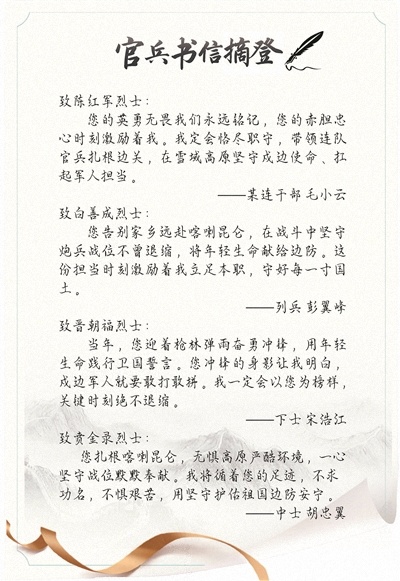 “你们用热血守护安宁,用生命铸就丰碑,你们的精神永远是我们前行的力量”“我们定会接过接力棒,坚守边关、寸土不让”……远方,苍茫的雪山绵延不绝,聆听着官兵们发自肺腑的告白。